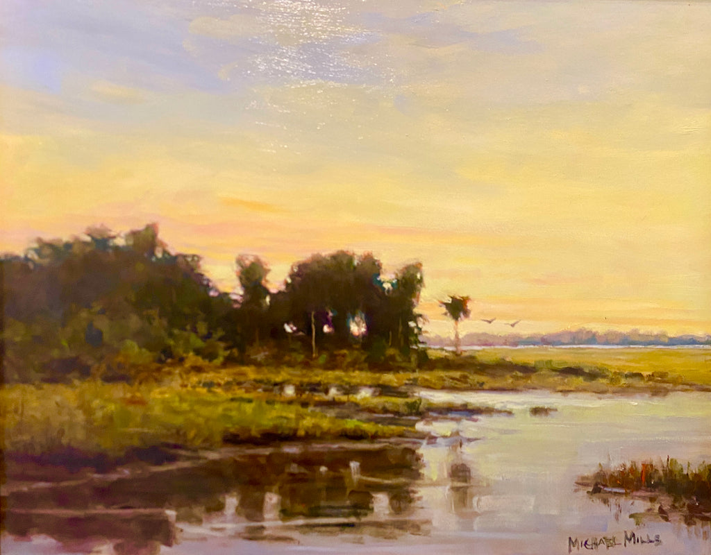 A luminous wash of lime and gold spills across the marsh, where still waters mirror the sky and land. Savannah Wildlife Refuge at the day's gentle end."