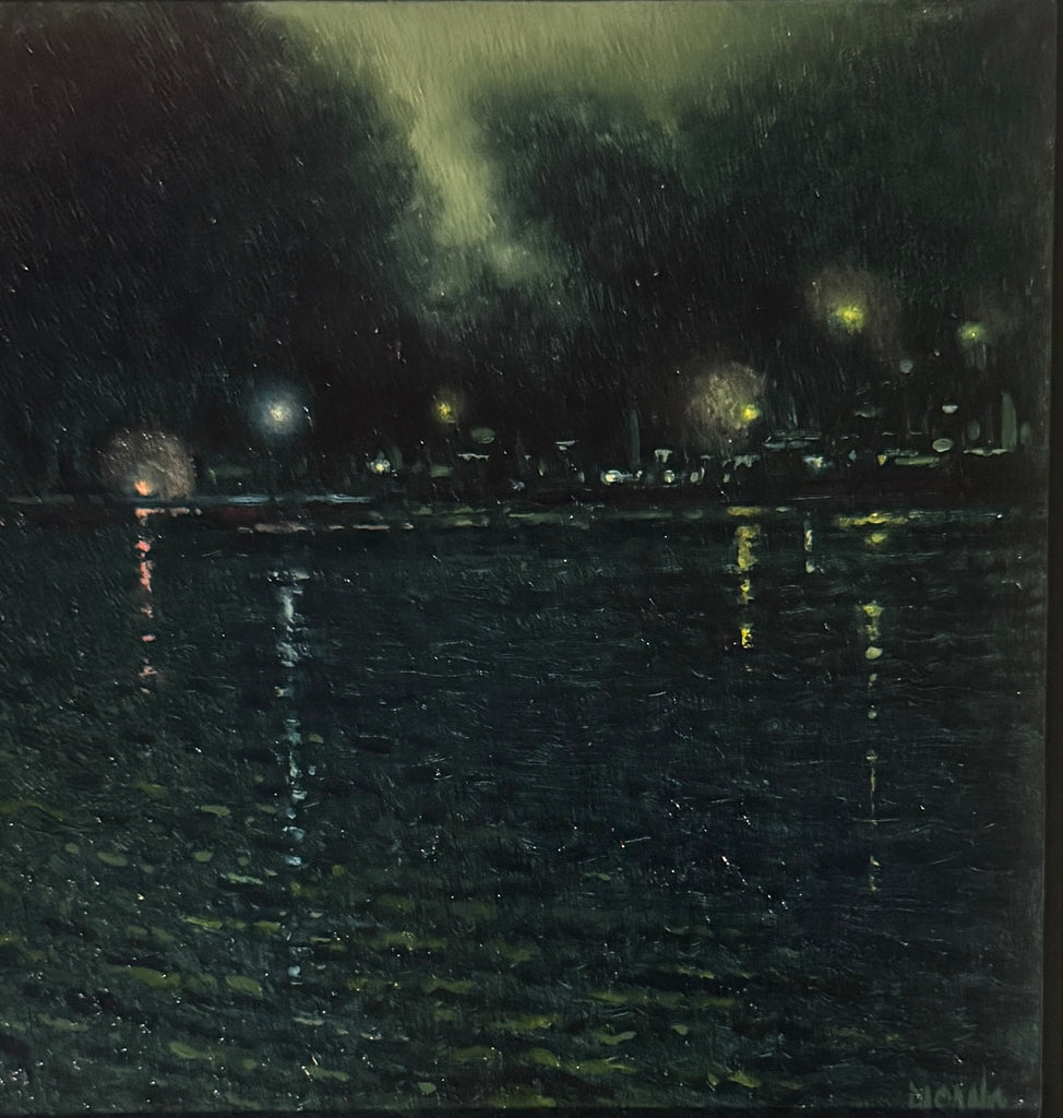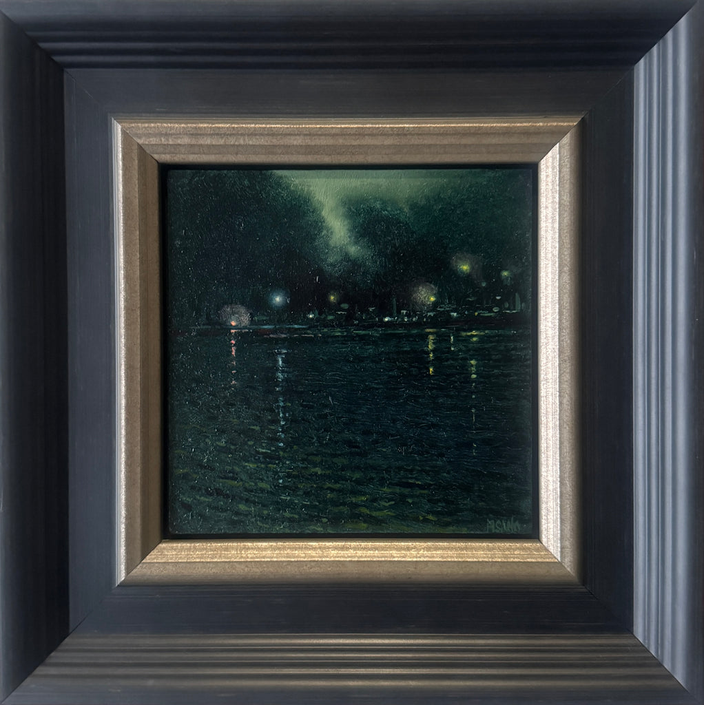 Actual size of "Dancing Lights" is 5-1/4" x 5-1/4". I wanted to create a whimsical Nocturne. A place where maybe fairies would dance at night. "Dancing Lights" was composed from many paintings and long nights into the early morning hours I have spent on site painting the night.