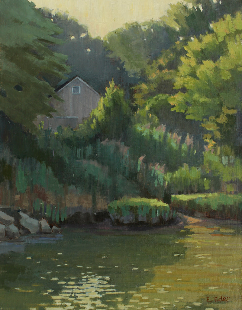 The lush foliage and mix of greens on the banks of the East River was the subject of this summer time painting.