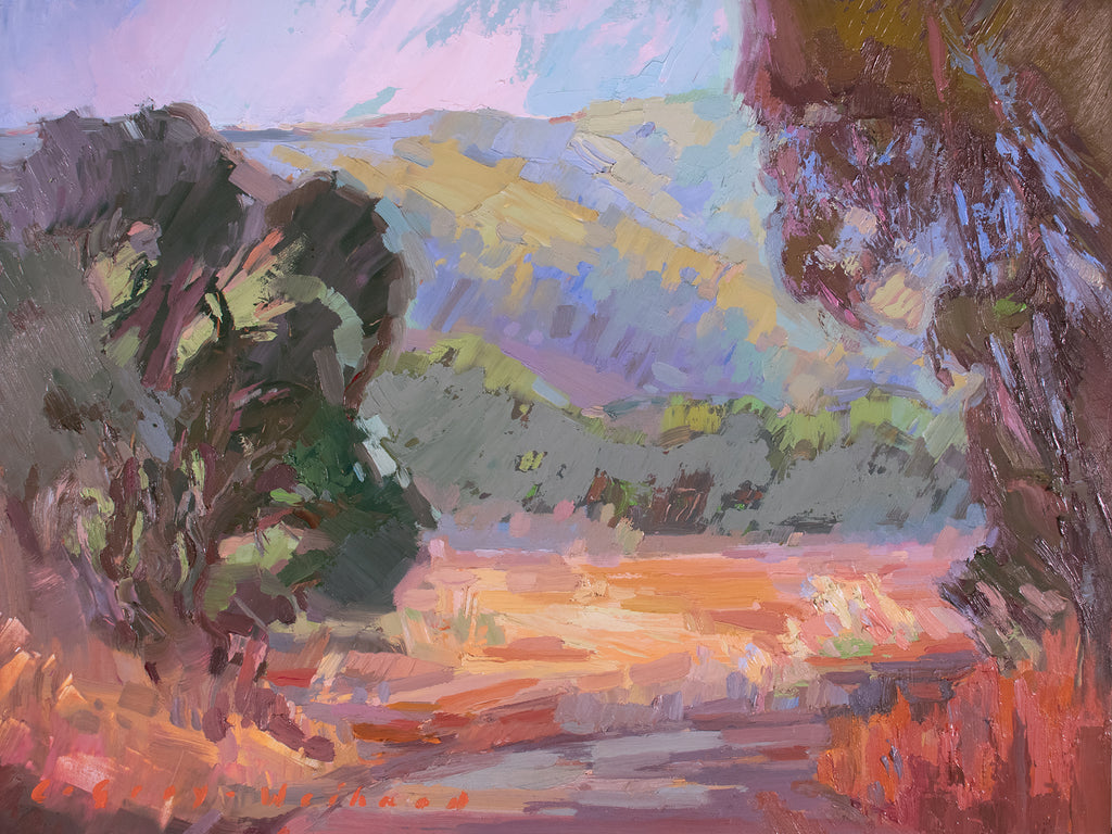 This painting was painted alla prima plein air while participating in the 31st annual Carmel Art Festival, Carmel CA. It was a sunny warm afternoon in Garland Regional Park. One of my favorite places to paint.