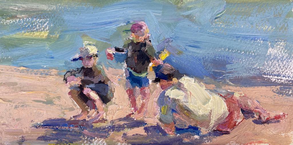 Under the soft warmth of the afternoon sun, a father and his children shape dreams out of sand. With hands covered in grains and hearts full of laughter, they work together to build a castle by the sea. The father's gentle guidance and the children's eager energy blend into a portrait of love, patience, and play. This painting captures more than a beach-side activity; it's a celebration of simple joys, shared moments, and the quiet magic of family.