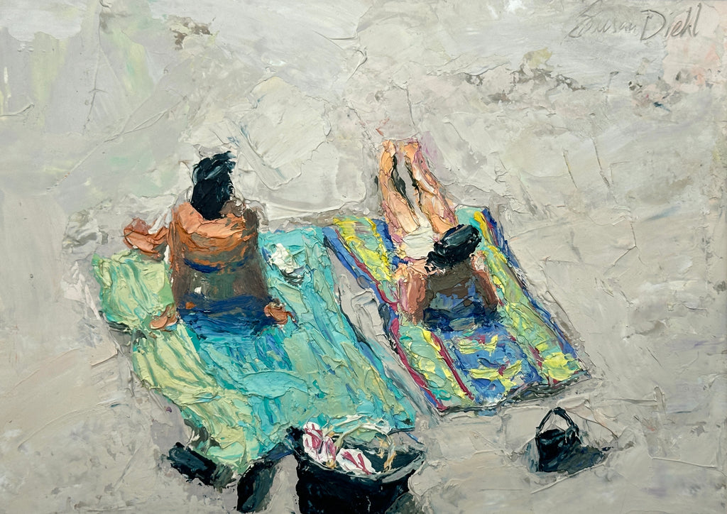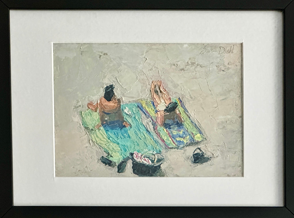 This was just fun to paint. Bright colors on the muted sand. The towels provide relief from the heat of the ground and act like a boundary set out to designate and secure a spot for you and your people to gather in the landscape, a place to regroup after a dip or get a drink when the sun has made you thirst. The sound of the waves, seagulls, the smell of salt air, all mingled with the smell of turpentine. An elixir for the painter on the beach.
