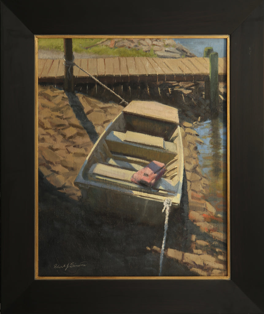 I found this small Jon Boat along the East River in Brunswick, Ga. It was low tide and the boat had settled on the rocks stretching its mooring lines to the limit. A faded old life preserver lay on the aft bench.