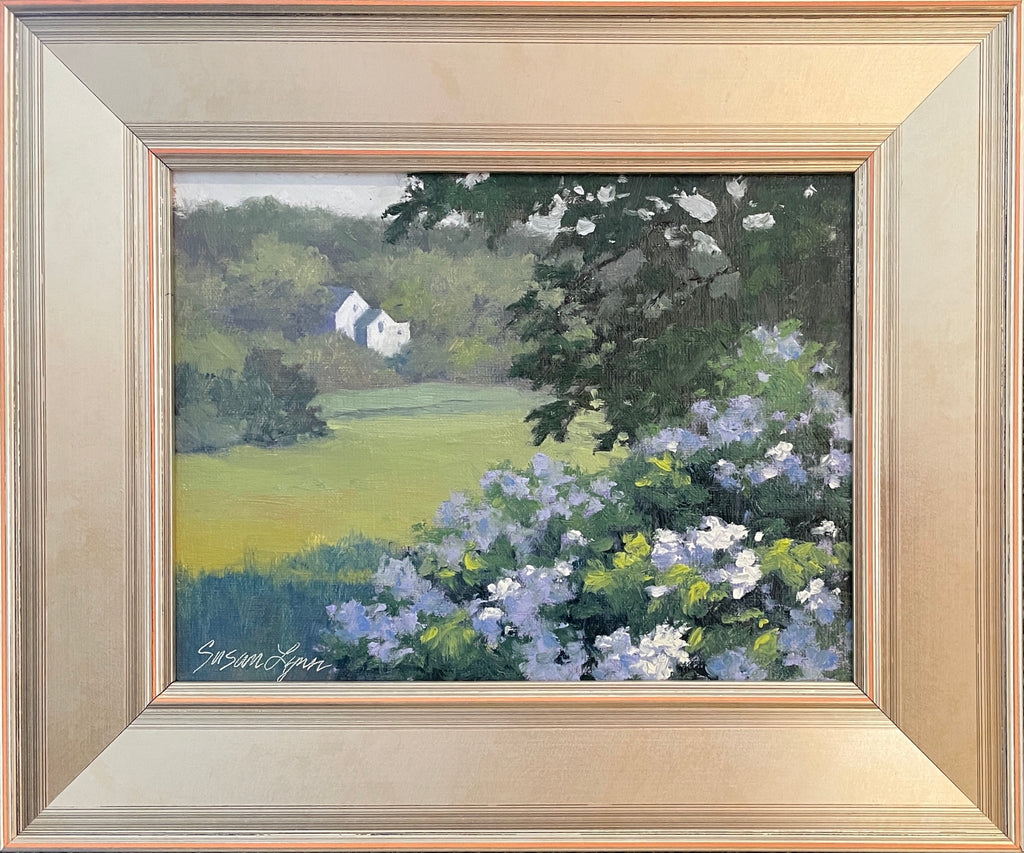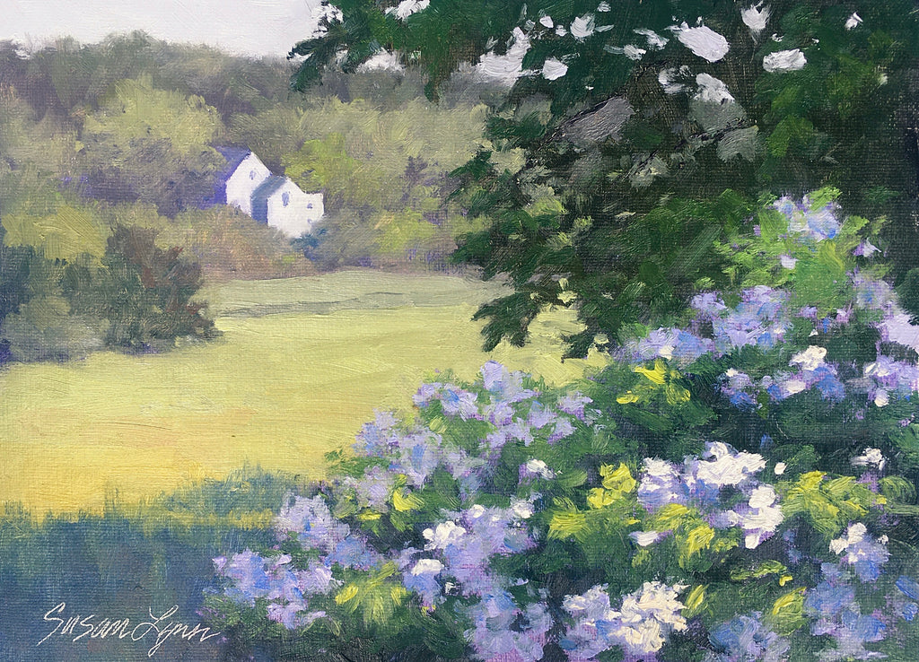 I painted this looking across the marsh grasses on Cape Ann, in a spot where I often paint. I loved the dappled light on the blooming azalea, echoing the light and shadow on the house nestled in the distant trees.