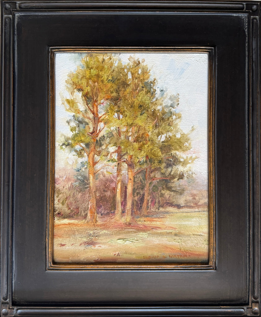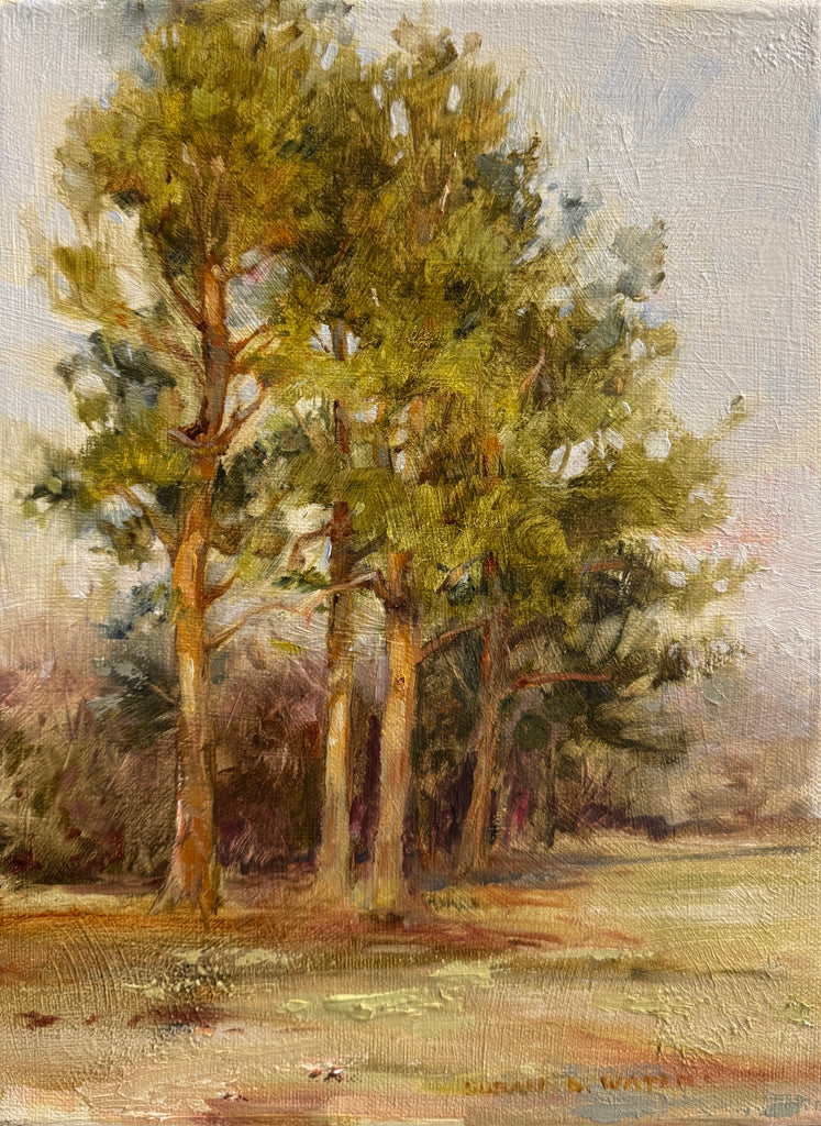 These pines are my neighbors, giving the opportunity to observe them yearlong and at various times of day. Not everyone's favorites, I love pines for their simplicity of form, scent and beautiful cones. Painted at the end of the day, en plein air.