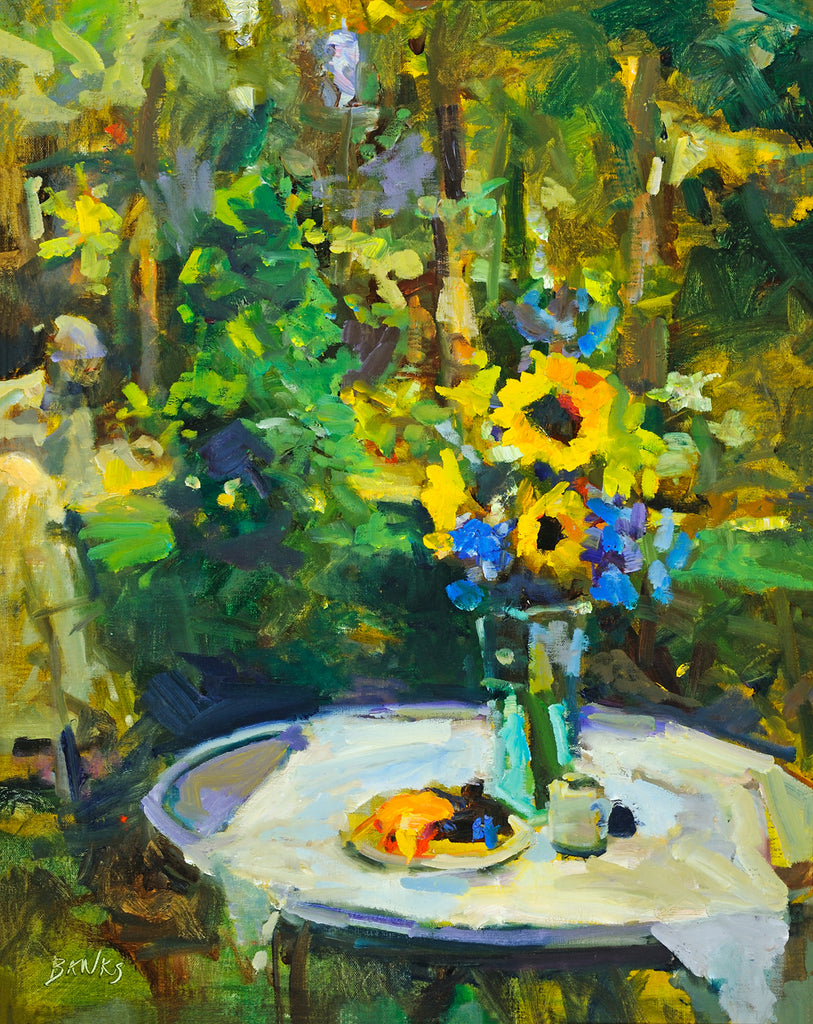 Sometimes the simplest touches make the moment. Flowers make me happy. Sunflowers even more so. This painting is all about making the everyday something special and taking the time to cherish that.