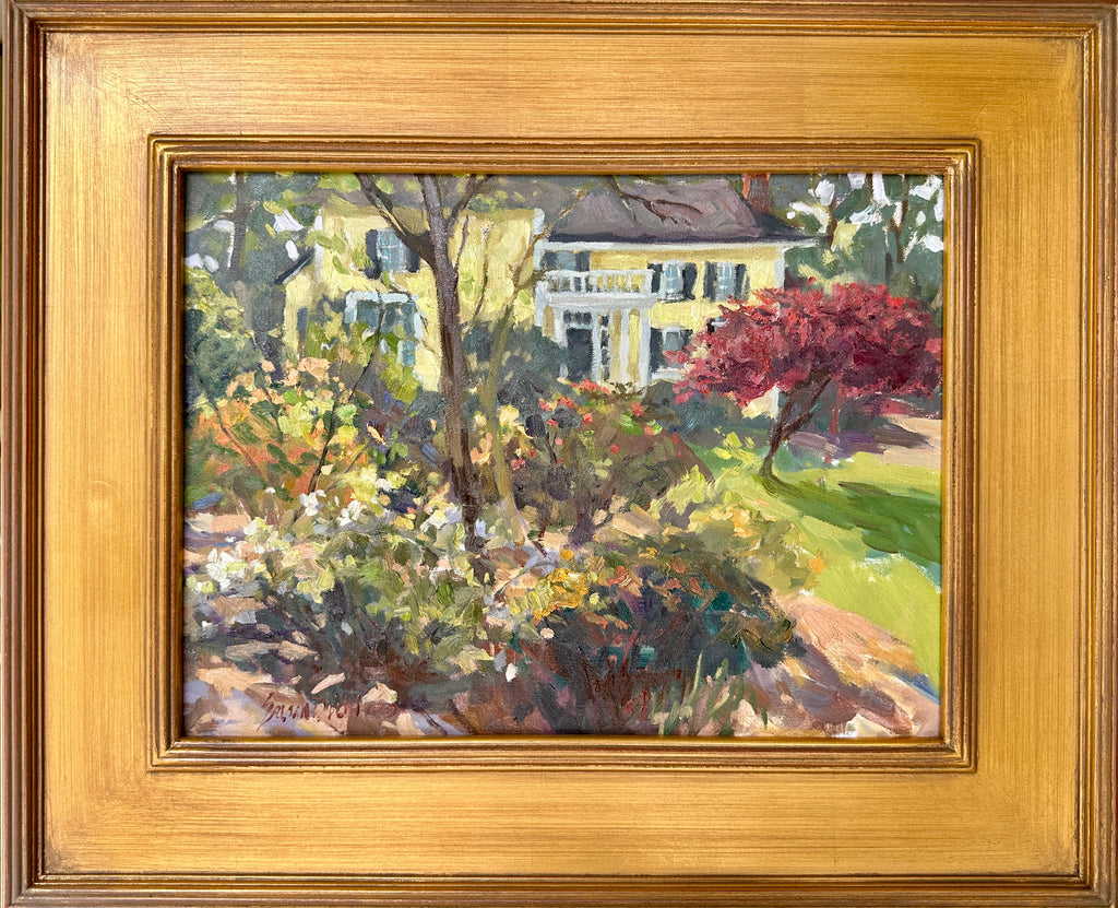 I found my spot, it was my first walk about when I arrived in Atlanta for the Olmstead Plein Air Invitational! I was just wandering up and down Oakdale Road when I saw this little side street heading up a small incline. I just follwed my gut. I got to the top of the hill and it turned right. The short row of beautiful homes ended in a culdesac. "Okay self, I said,I have arrived"! There before me were beautiful homes with gardens in the front yards that were to die for. One with a mass of roses and pink peonies and a yellow one with black shutters and azaleas and a beautiful japanese maple. One of my favorite morifs; homes with gardens. Where to start! So I started with the yellow one! Much to my delight the owners came home and out for a chat! I think I met everyone that evening who lives in that little spot. An added benifit to the ambiance of the motif is the friendly folks too!