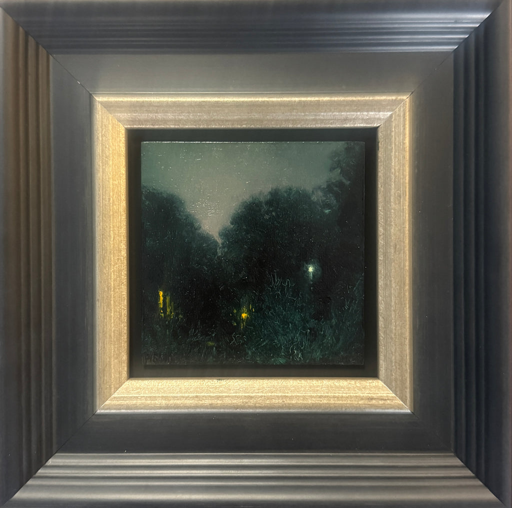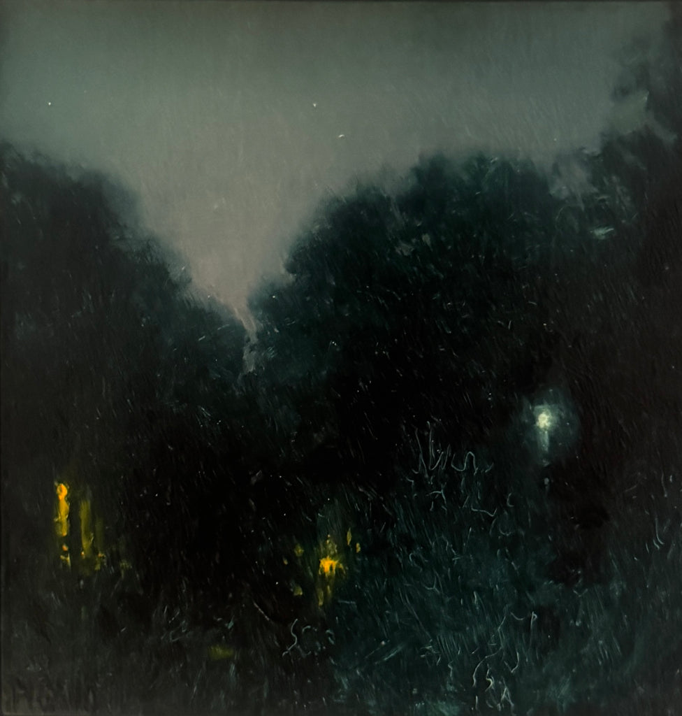 From my car as I was putting my gear back in at the Olmsted gallery from the parking lot and I had to paint the mystery of the lights of the house is behind the trees or whatever they may be.