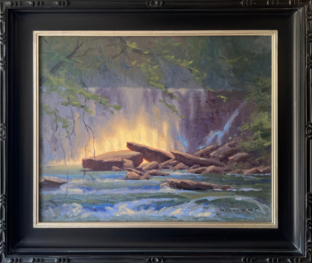 After scouting for locations throughout Georgia, I came back to a place I remembered from a year ago, the old mill at Vickery creek. The view greeted me with something better than I remembered: glowing morning light on the waterfall behind the familiar large boulders. This scene caused me to immediately get out my painting gear.