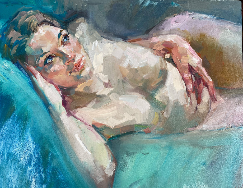 Serene Reflections captures a moment of quiet contemplation, where light and color blend harmoniously to evoke a sense of peace. The reclining figure, rendered with expressive, textured brushstrokes, gazes softly into the distance, lost in thought. Warm flesh tones contrast with cool blues and teals, creating a luminous atmosphere that enhances the painting's dreamlike quality. The artist's loose yet intentional strokes imbue the piece with movement, while the interplay of light and shadow adds depth and emotion. A study in tranquility and introspection, Serene Reflections invites the viewer to pause and immerse themselves in its gentle, meditative beauty.