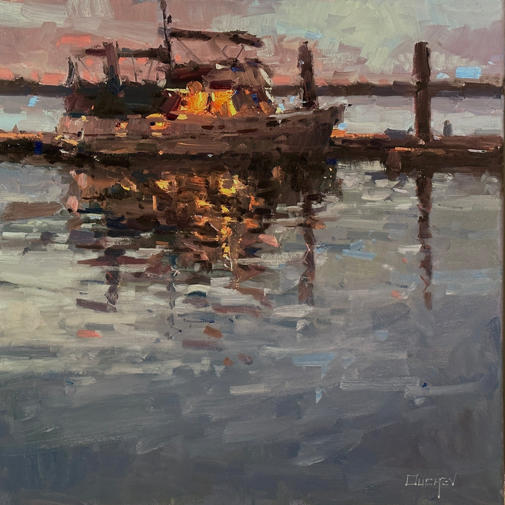 The painting portrays a serene nocturne, where a single boat drifts quietly on the still, dark water. A gentle light emanates from the boat, casting a soft golden glow that dances delicately on the surface, breaking the darkness with its warmth. The vastness of the water, blending seamlessly into the night sky, creates a sense of infinite calm. The solitude of the boat and its lone light evoke a profound peacefulness as if the world has paused to admire the quiet beauty of the moment. This evocative scene invites the viewer to embrace its tranquility and find solace in its simplicity.