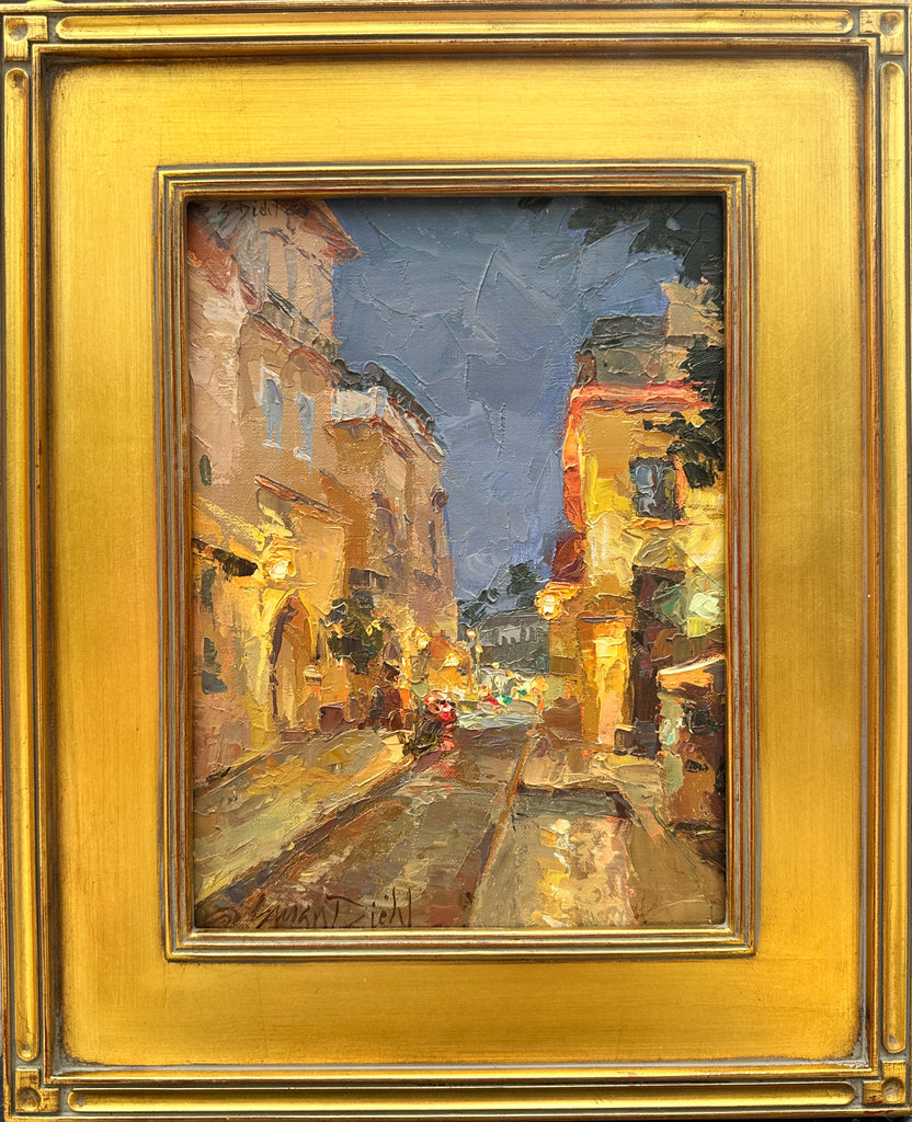 After dinner we steeped outside. The sky was the most beautiful color of indescribable blue. It's cool darkness made the lights from the street businesses ever more brilliant. The air was fresh with a slight breeze, I needed to commit this feeling to memory until I could get it in front of my easel! I wonder how many folks have walked these streets before I did and what was the drama playing out in their story at the time? Life goes on and the echoes of their footsteps are chronicled in the cobblestone.