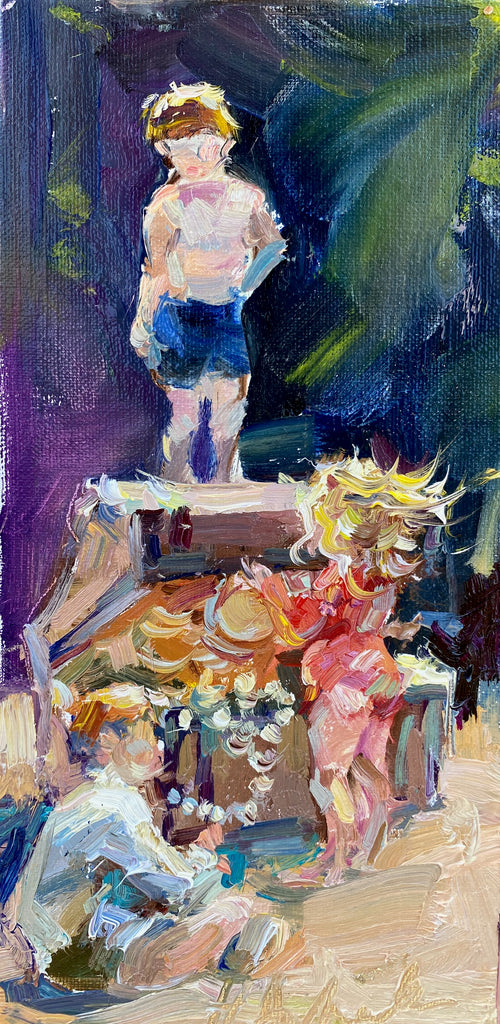 In this vibrant and heartwarming scene, a group of children gather around a weathered treasure chest, their faces lit with joy, wonder, and curiosity. The painting captures a moment of discovery -- not just of gold and trinkets, but of imagination, friendship, and adventure. Sunlight spills through the trees, casting a golden glow over their excited expressions and the colorful contents of the chest. With muddy knees, tangled hair, and wide eyes, these young explorers remind us that the real treasure is the magic of childhood and the stories we create together.