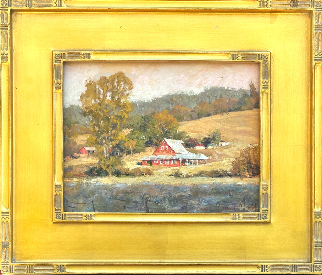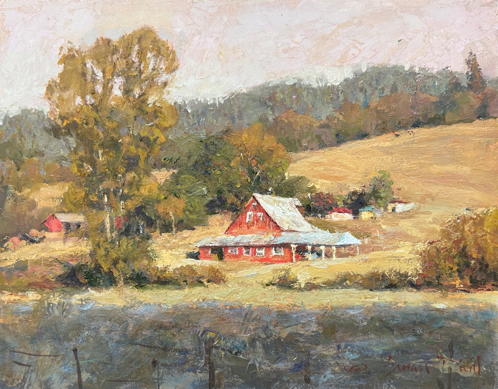 What is it that pulls us into a scene, that makes our pulse march a little quicker, sends a tremor running up our spine, and heightens the awareness of our senses. Breathing in the sounds, and the smells, tasting the colors, all compel us and touch a cord in our perception of that moment. What caused us to stop at this spot to paint was a fleeting moment, so insignificant in time as to wonder if it ever really existed, yet it possessed the qualities that one can remember it forever, access the moment years far away. This moment is as fresh in my mind as if it were replaying itself over and over. I almost don't want to tell you what it made me feel, as your experience of it will be different... and yours. But mine was archetypal, the sun was just peeking its head over the top of the woods and would light up the stage, as if the yellow pink light existed just to show this one particular motif in its best possible way. . It reminded me of all the mornings of the universe, waking up, a part of our universal lexicon, a new day, bringing the chance for righting wrongs, standing tall, being of value to yourself and others. All that said, my only purpose in painting it is to give you, the viewer a place to remember your moments in time.